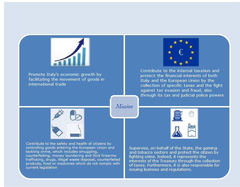 ADM is a regulatory and supervisory authority, with the power of imposing sanctions in the sectors of Customs, Energy (mineral oils, electricity, naturalgas, LNG, coal), Alcohol, Tobacco products and Public Gaming. In such sectors, it assesses and collects duties and taxes. Moreover, it carries out judicial police functions.